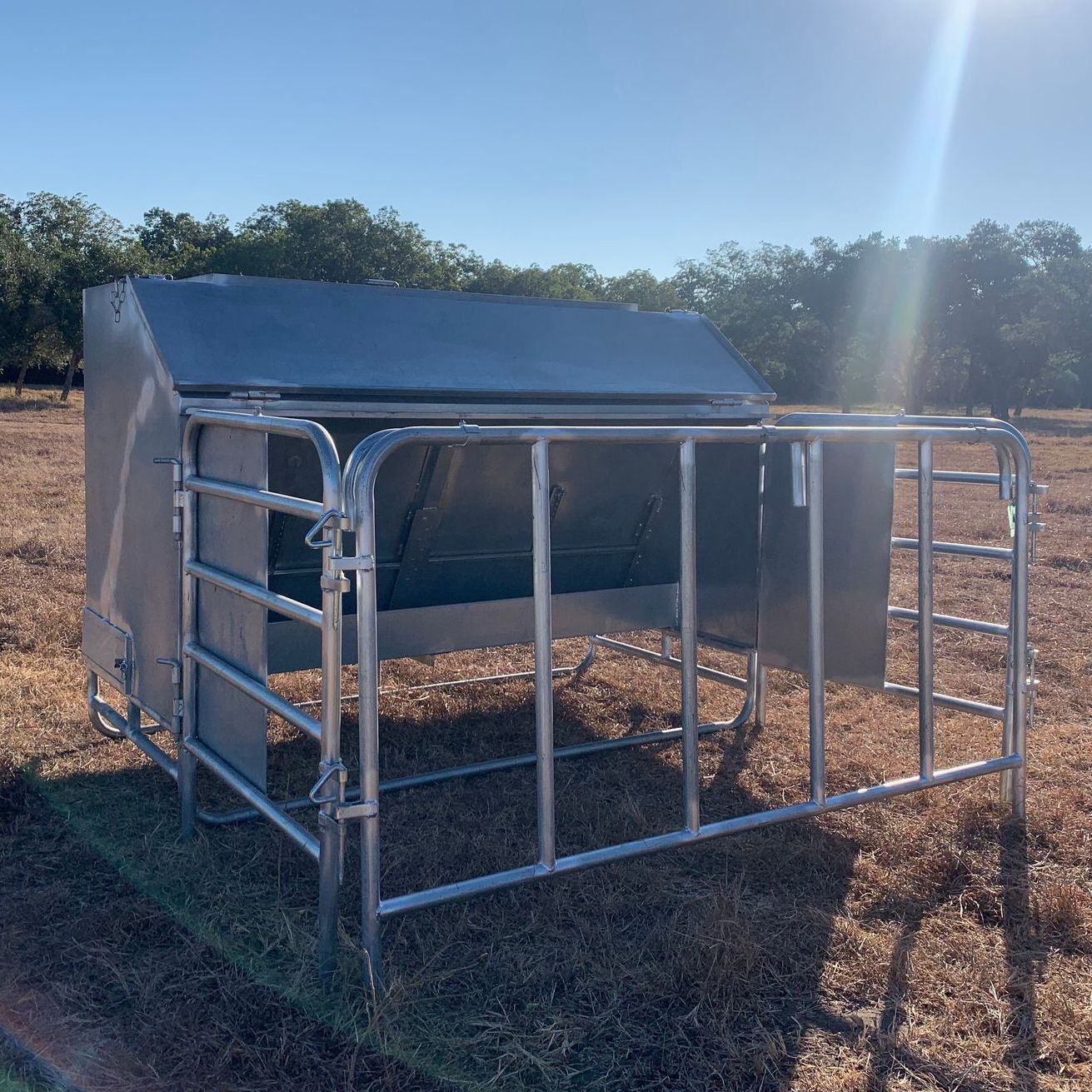 The 4’, 6’ rigid built, and 8’ creep feeders are made from 16 gauge G-90 galvanized sheet metal with 1 ⅝” schedule 40 galvanized skids. These models feature a poly trough, adjustable feed doors and an easily accessible clean out door on the end. 4’ and 8’ models have a collapsible hinged panel feed pen and the 6’ rigid built has a feed pen welded to the feeder. A large sliding lid on top makes filling the creep feeders easy. Feeders also come with a 1 ⅝” 16 gauge adjustable creep entrance panel that you can set the height to control feeder traffic. All welds after manufacturing are painted with cold galvanized paint and aluminum structural paint.