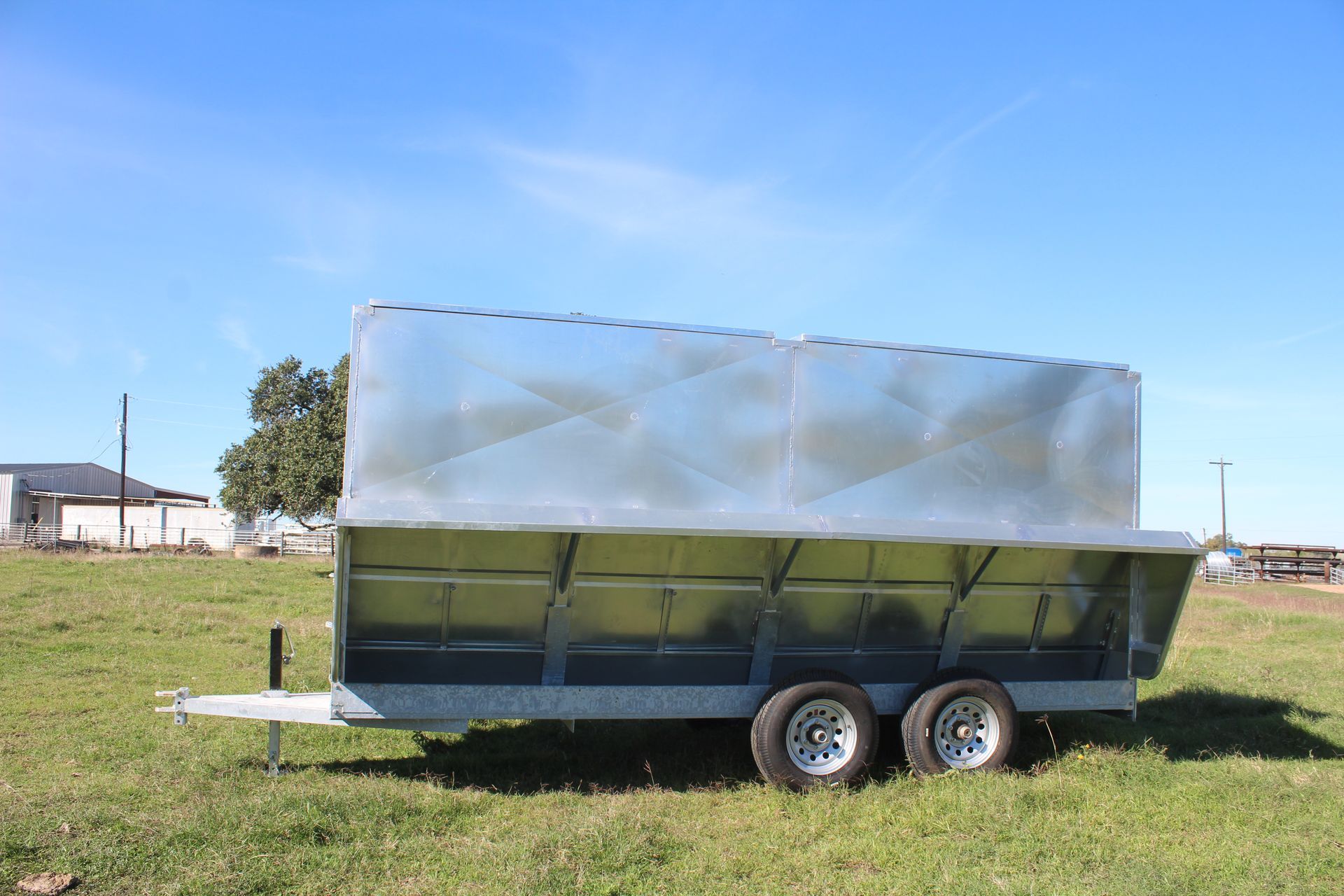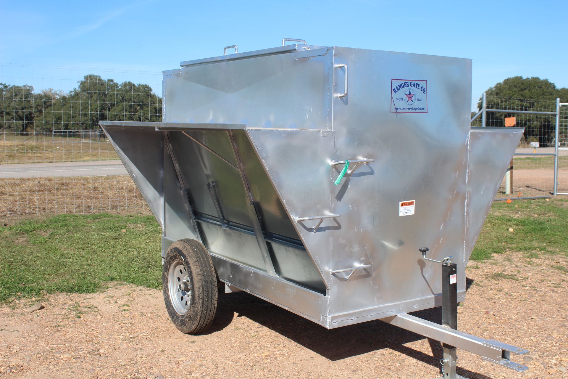 Ranger Gate bulk feeders feature G90 domestic galvanized sheet metal for years of corrosion free usage. The 14 gauge adjustable doors allow you to set the amount of feed that comes out of the feeder and 7 ½’ wide sliding doors on top of the feeder allows trouble free loading. A ¼” heavy duty poly trough guarantees a never rust out trough and is equipped with a easy open clean out door. Models are available with wheels or skids for ranchers and feedlot usage. All trailers come with new tires and axles.